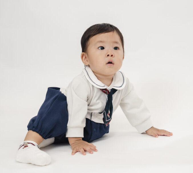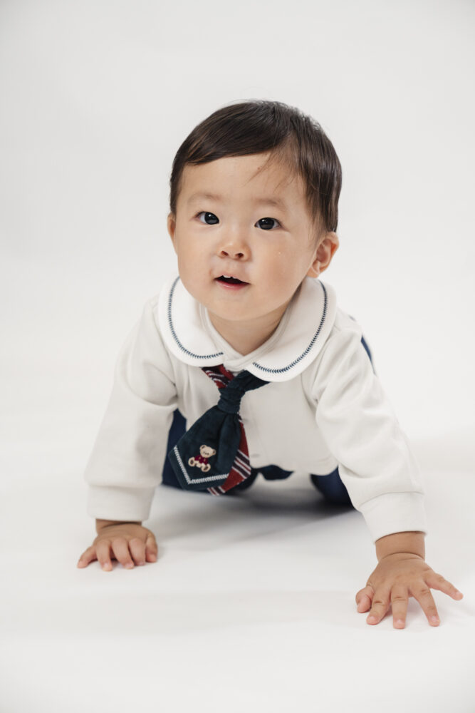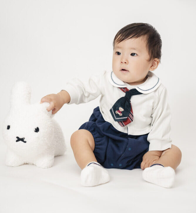 ちょっと懐かしい雰囲気のカバーオールは、普段着はもちろん、セレモニーにもおすすめ👌